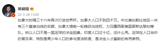 黄健翔写道:“加拿大时隔三十六年再次打进世界杯。加拿大人口不到四千万。中北美加勒比地区一共有三个直接出线的名额,加拿大体提前一轮稳获出线权,力压墨西哥美国哥斯达黎加等队。所以人口不是一国足球的决定因素。印度人口过十亿,没什么用。足球在人口当中的普及率,特别是青少年人口的参与度活跃度,是决定人才基数的有用参照。”